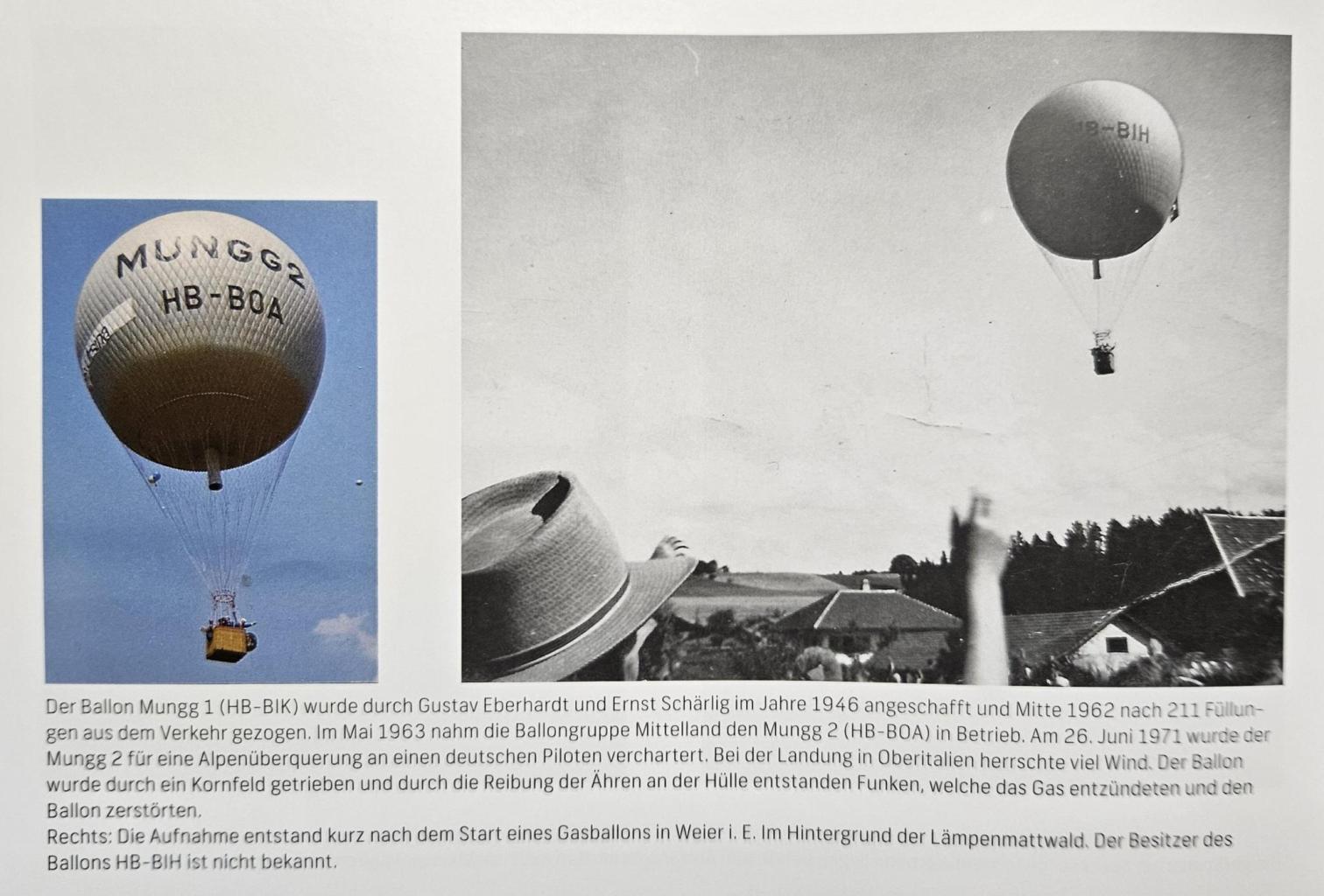 Gespannt sind wir auf die neue Attraktion mit dem Start der Gasballonen am Samstagnachmittag. In der Gemeinde Affoltern wurde doch schon vor fast 80 Jahren mit einem Gasballon gestartet. Der Ballon „MUNGG 1“ von Gustav Eberhardt und Ernst Schärlig (Grossmetzger im Weier) sorgte ab 1946 bis 1962 für Aufsehen.
