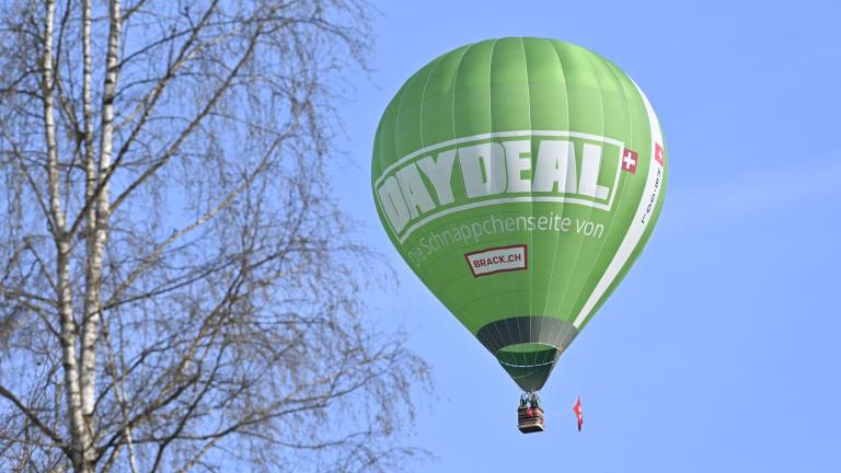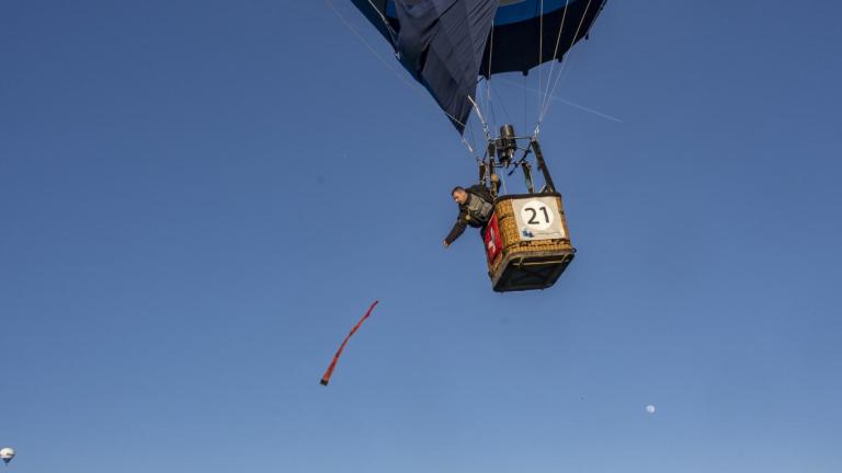Am Donnerstag, 10. April 2025: Ballonpilot Roman Hugi (Startnummer 21) wirft den Marker genau aufs Kreuz. Die Zuschauer applaudieren: Bravo Roman!