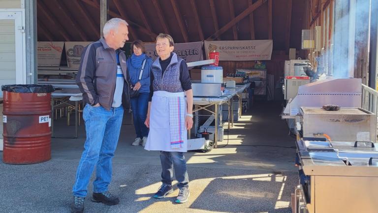 Edith vom OK (rechts; im Gespräch mit einem Helfer) hat alles für die Gastronomie vorbereitet. Mit dem schönen Wetter freut sie sich auf viele Gäste.